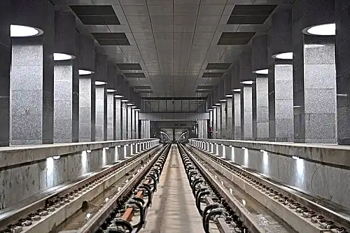 Kuntsevskaya is a station on the Bolshaya Koltsevaya line of the Moscow Metro. It was opened on 7 December 2021 as part of the section between Mnyovniki and Kakhovskaya.[2] It includes transfer to Kuntsevskaya.[3][4] However, the station is widely criticised for its long transfer tunnels, as well as for narrow platforms.[5]
