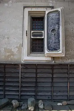 Windows were often situated high up in the kura and were frequently left open to provide ventilation, although there were often iron bar grilles to prevent theft. Windows were often formed in a similar way as doors with a stepped perimeter. When a fire broke out both the doors and the windows were closed and their edges were covered over in plaster.[28]
