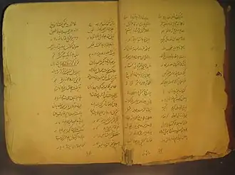 The earliest "proper 'text'" written in Kurdish[4] is a Kurmanji translation of a Christian prayer in Armenian letters, copied between 1430 and 1446 and preserved in an Armenian manuscript. Besides this, the earliest written works in Kurdish are from the 16th and 17th centuries.[5] Information about the earliest Kurdish poets is incomplete. The dates for authors given by Mahmud Bayazidi, once the sole source for the subject, are not considered reliable. Little information survives about Ali Hariri,[2] whom Bayazidi dated to the 15th century but who, according to Thomas Blois, should be placed later.[6] Melayê Cizîrî (1570–1640) is said to have been the founder of a school of Kurmanji poets who wrote in the sub-dialect of Jazira/Bohtan. Cizîrî left behind a large number of poems, including qasidas (odes) and ghazals (lyrics), some of which are still popular. Feqiyê Teyran (1590–1660) was supposedly Cizîrî's student. He also wrote qasidas and ghazals, and he was the first known Kurdish poet to write narrative poems using the mathnawi (couplet) form.[2] His Hikayeta Şêxê Sen'an (The story of Sheikh Sen'an) is a well-known epic poem.[7]