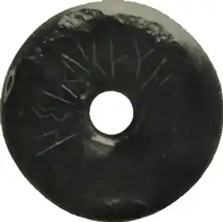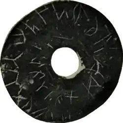 Two coal spindle whorls inscribed with Old Turkic script and diameters between 3.5–6 cm[20] were discovered north of Lake Baikal. The first spindlewhorl was found outside of Narin-Kunta. During the 1910s the location was the primary Kurumchi dig site.[30] Donner and Räsänen[31] presented a translation of the first spindle whorl subsequently accepted by most researchers.[32][33][34][35] The second spindle whorl was discovered by farmers plowing a field near Shokhtoy. Donner and Räsänen were only able to distinguish some of the eroded characters. They offered "the fifth of the snowy month" and "the fifth month of the arqar year" as partial translations.[36] Gavriil Ksenofontov,[37] S. E. Malov,[38] Hüseyin Orkun,[35] and Louis Bazin[39] subsequently have offered their own translations. In 2019 Tishin made a comprehensive translation of the Shokhtoy spindle whorl.[40] Both spindle whorls have become lost, with only photographs remaining.[41] An assistant and student of Petri, Gavriil Ksenofontov,[29] characterized both spindle whorls as random discoveries found by non-archaeologists.[42] In particular, as the Shokhtoy spindle whorl was discovered by chance outside an organized excavation, Ksenofontov didn't believe the Kurumchi created the item.[43]