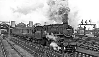 Between 1975 and 1983, No. 43106 saw use on the mainline hauling railtours.[2] In 1975, it attended the Rail 150 celebrations in Shildon[5] and in 1980 it took part in the Rocket 150 celebrations at Rainhill. On a small number of occasions between 1980 and 1983, the engine saw use on a limited number of railtours, on some occasions double heading with fellow SVR based engines including: 5000, 7812 Erlestoke Manor and 80079.