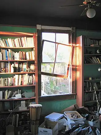 Upstairs library room in home where downstairs flooded Lakeview neighborhood. Hurricane winds blew out window, but left books in shelves