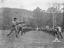 The training centre draws its lineage from the Jungle Training Centre that was formed in November 1942 in response to the requirement to train troops for jungle combat in the South West Pacific Area during World War II.[2] Under the command of Colonel Alex MacDonald, who had previously commanded the Darwin Mobile Force,[2] the centre grew out of the Guerilla Warfare School that had been established earlier at Foster, Victoria.[3] Located in the Gold Coast hinterland below the Beechmont plateau that stretches towards Tamborine Mountain, the establishment was located amidst thick rainforest and steep, razor-back country.[4] Staffed by instructors that had experienced combat – mostly in the Middle East, initially, but then in New Guinea as the war progressed[5] – upon creation the centre consisted of a number of detachments including the Reinforcement Training Centre, the Independent Company Training Centre and the Tactical School. As the demand for specialised jungle warfare training grew with Australia's increased involvement in the Pacific, the centre was expanded until it consisted of about 2,000 trainees organised into eight training companies; each week a total of 500 personnel marched out to join the infantry battalions fighting in the New Guinea campaign having completed a four-week course. In addition, the Commando Training Battalion was formed to provide reinforcements for the Australian commando units, while an officer training wing focused upon delivering specialised platoon-level training for officers over the course of a six-week program.[2] After May 1943, the centre began to contract as its need declined, although it continued to train large numbers of soldiers under experienced senior instructors such as Major Harry Harcourt.[6] It was finally disbanded in 1946 following the conclusion of hostilities.[2]