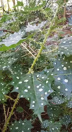 It has decorative leaves marked by conspicuous white spots and is covered in stinging hairs. It is a sprawling, herbaceous perennial or annual, growing to about 1 m tall. Its soft, erect stems armed with stinging hairs have a tendency to root at the nodes, and are therefore readily propagated from cuttings. Leaves are alternate, triangular, coarsely toothed, and also covered in stinging hairs. The white spots on the leaves are not always present, but when there a stinging hair is found at the centre of each white spot - the lower leaf surface and petiole are well-covered. The stinging hairs are carried on slender protuberances, and can inflict a painful, burning sting that may cause localised redness of the skin.[4]