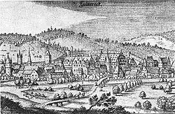 The last named is taken to be the actual "Lauterecken comital line", which characterized the town with the building of two castles, whose appearance is preserved in Matthäus Merian's engraving from about 1650. Thus, from 1543 to 1694, Lauterecken was the residence town of the sideline of Palatinate-Veldenz-Lauterecken. In 1689, however, the town and castles were destroyed. When Count Gerlach I founded the original County of Veldenz, Lauterecken had evidently outstripped the neighbouring village of Medard. Even before 1350 (likely in 1349), Lauterecken had been raised to town. In the latter half of the 14th century, the fortifications sprang up with three gates (Untertor or "Lower Gate", Bergtor or "Mountain Gate", Obertor or "Upper Gate") and five towers, of which three stood near the gravely endangered Lower Gate and two others at corners in the defensive wall (these two can be seen in the Merian engraving). Any attempt by historians to describe a castle integrated into the town fortifications at this early time has come up against considerable difficulties. There can, however, be no doubt that there was a castle complex either within the town or nearby that served a mainly defensive purpose rather than that of simply representing the local lords. In 1384, it was said that the work on the original town fortifications was completed. At the so-called brotherly partition in 1387, Count Friedrich of Veldenz received the town of Lauterecken with its castle and Burgmannen along with a few outlying villages, while Medard passed as a village in the Amt of Odenbach to Count Heinrich. In 1393, Count Friedrich III founded an actual Amt of Lauterecken, which he expanded by adding to the hitherto small region the Ämter of Nerzweiler, Reichenbach and Bosenbach. Belonging to this new Amt were the following places: Albersbach, Aschbach, Bettenhausen, Bosenbach, Eßweiler, Föckelberg, Fockenberg, Gimsbach, Hinzweiler, Hundheim, Jettenbach, Kollweiler, Lauterecken, Limbach, Lohnweiler, Matzenbach, Miesenbach, Mühlbach, Nerzweiler, Neunkirchen am Potzberg, Niedersteegen, Niederstaufenbach, Obermohr, Oberstaufenbach, Obersteegen, Oberweiler im Tal, Reichenbach, Reichenbachstegen, Rothselberg, Rutsweiler am Glan, Schrollbach, Theißberg, Wiesweiler and other places that now no longer exist. In 1444, the County of Veldenz met its end when Count Friedrich III of Veldenz died without a male heir. His daughter Anna wed King Ruprecht's son Count Palatine Stephan. By uniting his own Palatine holdings with the now otherwise heirless County of Veldenz – his wife had inherited the county, but not her father's title – and by redeeming the hitherto pledged County of Zweibrücken, Stephan founded a new County Palatine, as whose comital residence he chose the town of Zweibrücken: the County Palatine Zweibrücken – later a Duchy.[7]