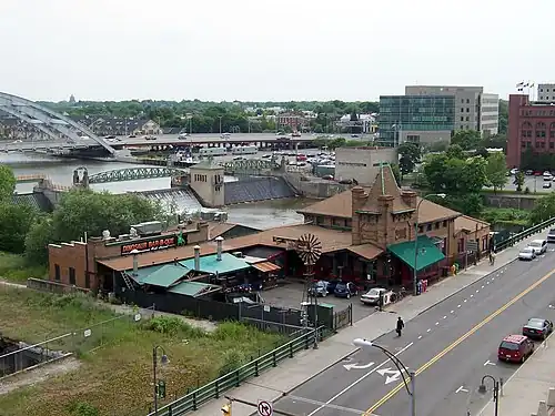 After a few years in the 1990s as a nightclub called Carpe Diem, the buildings now house Dinosaur Bar-B-Que.[1] In 2018, a re-development project on the site of the former Rochester Subway Court Street station and remains of the service road resulted in a luxury high rise being built next door and in one of the footings used to support the station being used to also support a pedestrian walkway called the Genesee Riverway Promenade.[7][8] From the promenade, one can see the former braces on the station deck that once helped support the train platform and tracks.