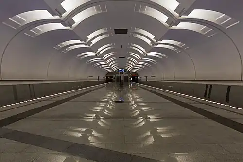 The station is shallow depth and has single-vault design with two vestibules at each end, which stairs connect to the platform.