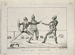 Capt. Levett Landon Boscawen Ibbetson, descendant of merchant Francis Levett, dueling in a trilobite exoskeleton. Drawn by his friend Gideon Mantell, fellow member of The Royal Society