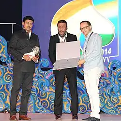 Film being felicitated at IFFI (2014). (From left) Rajyavardhan Singh Rathore, Jackie Shroff and Andrey Zvyagintsev