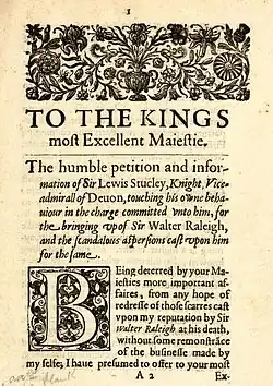 There were in fact two published documents in which Stucley put his side of the argument, an Apology, and the Petition of 26 November. There was also an official defence of the king's proceedings, the Declaration, written by Francis Bacon, possibly with Henry Yelverton and Robert Naunton. The Apology having failed, Stucley issued the Petition in effect asking for official backing; which was published in the Declaration of 27 November, the printers having been up all night.[19][20][21]