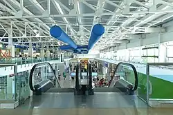 Concourse B is situated in a satellite building connected to the main terminal by a walkway. This concourse serves international flights, primarily from the United States and Canadian airlines. It offers seating areas, food stands, restaurants, a VIP lounge, and duty-free shops.[3] The satellite has 15 gates (gates 6-20B) spread across two floors, with those on the top floor equipped with jet bridges. All international airlines operate from this area.[4]