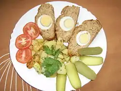 | Stefánia szelet | A loaf of ground meat or Stefania slices (Hungarian meatloaf with hard boiled eggs in the middle, which makes decorative white and yellow rings in the middle of the slices. | ||