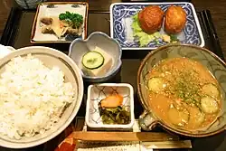 • Japanese curry - rice - imported in the 19th century by way of the United Kingdom and adapted by Japanese Navy chefs. One of the most popular food items in Japan today. Eaten with a spoon. Curry is often eaten with pickled vegetables called fukujinzuke or rakkyo