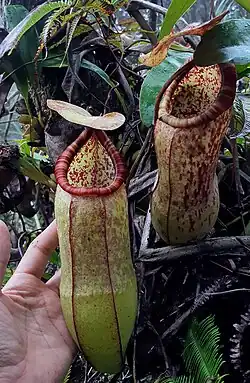 The official IUCN conservation status of each species is taken from the latest edition of the IUCN Red List.[1] Unofficial assessments based on the IUCN criteria are also included, but are presented in italics. Unless otherwise noted, taxonomic determinations and all other information are sourced from Stewart McPherson's two-volume Pitcher Plants of the Old World, published in 2009.[2] Where recent literature provides an altitudinal distribution that falls outside the range given in Pitcher Plants of the Old World, the discrepancy is noted.