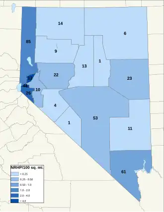 1. ^ The Marlette Lake Water System extends into three entities: Carson City, Storey County, and Washoe County; the Applegate-Lassen Trail extends into Humboldt, Pershing, and Washoe counties; the Derby Diversion Dam extends into Storey and Washoe counties and the Virginia City Historic District is in both Storey and Lyon counties.