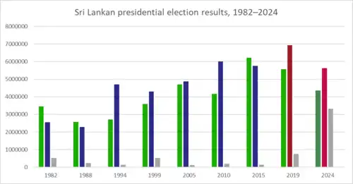 | 2019 | Gotabaya Rajapaksa | SLPP | 6,924,255 | 52.25% | Sajith Premadasa | NDF | 5,564,239 | 41.99% | 764,005 | 5.76% | 13,252,499 | 83.72% | ||