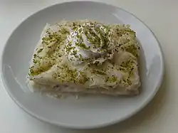 | Soğuk baklava | Phyllo pastry, dairy | Thin layers of phyllo brushed with clarified butter, poured with a type of cold sharbat syrup consists of milk and sugar and served with cocoa or grated chocolate on top. | |