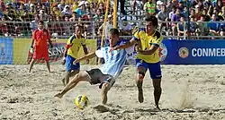 Beach sports are a classification of sport activities which are conducted on a sand surface. They are traditionally associated with being played on a natural, coastal sand beach, but also often take place on artificially constructed in-land playing fields using imported sand.[1][2][3] Some beach sports are played on hard, compacted and smooth sand, whilst others are played on soft, loose and uneven sand; a handful are played on both. Many are sand-based adaptations of sports already well established on other surfaces;[4][5] most are played in smaller playing areas than their parent sports due to the more difficult and exhausting nature of traversing such a yielding terrain.[5] The popularity and range of beach sports has experienced a notable rise since the emergence of pro beach volleyball as a successful commercial venture in the 1980s.[1][6][7] Beach sports are practiced from a range of casual and non-competitive to professional-level competition.[4][5]
