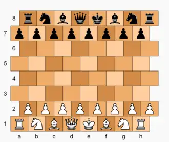 - Pre-chess: The game starts with white and black pawns set as usual, but the initial position of other pieces is selected by the players. White first places one of their pieces on their first rank, and then Black does the same. Players continue to alternate in this manner until all pieces have been placed, with the only restriction being that bishops must be on opposite-colour squares. The game then proceeds in the usual way. Proposed by Pal Benko in 1978.[11]