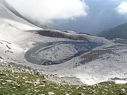 3,700 metres (12,100 ft) | Neelam Valley, Azad Kashmir | The lake is accessible from Dowarian by a 19 kilometers (12 mi) hiking trek. Dowarian is the base camp to this lake. | [28] |