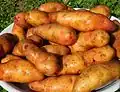 This is a list of potato varieties or cultivars. Potato cultivars can have a range of colours due to the accumulation of anthocyanins in the tubers. These potatoes also have coloured skin, but many varieties with pink or red skin have white or yellow flesh, as do the vast majority of cultivated potatoes. The yellow colour, more or less marked, is due to the presence of carotenoids. Varieties with coloured flesh are common among native Andean potatoes, but relatively rare among modern varieties. They are rarely cultivated because their yield is usually lower than that of improved varieties and are sought after by some amateurs as a curiosity.