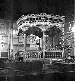 1770[1]: 62 –1913[27] | The layered, pitched roof visible in surviving exterior photographs conceals a series of massive trusses from which the great dome was suspended.[28] The roof, which features three well-defined stages, was considered one of the most architecturally complex and interesting of wooden synagogue roofs.[29] The synagogue was enlarged in the nineteenth century by the addition of one story extensions on each side for the use of the women of the community.[28]: 231–2 |