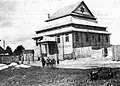 The synagogue is a wooden log structure of rectangular plan, built on a rough-stone concrete foundation and divided into two floors in the west. The structure is spanned with a hipped rafter roof covered with tin. On the exterior, the building is protected with horizontal weather-boarding above the windowsills of the prayer hall, and a vertical one below them.[13] A prayer hall of almost square plan is situated on the eastern side. On the western side, the building includes a vestibule and a small room with a stove, which also heated the prayer hall. A staircase in the southwestern corner leads to a women's section on the first floor, which opens to the prayer hall with two long rectangular windows. The main entrance to the building is in the western wall and the women's entrance is on the southern wall. Ten round-headed windows opened from the prayer hall: three windows on the southern and northern walls and two pairs of windows on the eastern wall. The windows of the vestibule and the women's section are rectangular. The ceilings are joisted flat constructions; that of the prayer hall is supported by two large beams, resting on the western wall of the women's section and the eastern wall of the prayer hall.[14] |