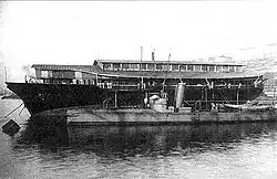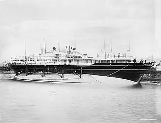 The Livadia was an imperial yacht of the House of Romanov built in 1879–1880 to replace a yacht of the same name that had sunk off the coast of Crimea in 1878. The new Livadia, intended for service on the Black Sea, was a radically novel ship conceived by Vice Admiral Andrey Popov, designed by naval architect Erast Gulyaev and built by John Elder & Co. of Govan on the Clyde. The Livadia continued Popov's line of circular ships although this time Popov sacrificed geometrical perfection for seagoing capabilities. She had a beam of 153 ft (47 m) against overall length of only 259 ft (79 m).[4] An extreme example of tumblehome architecture, she sported a conventionally shaped superstructure mounted on a wide, flat-bottomed, turbot-shaped submerged hull or pontoon.