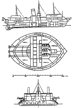 Naval architects of the 1860s tended to increase the beam and reduce the length of their armored ships.[8] This change of the proportions maximized the internal volume protected by the same amount of side armor.[8] It was heralded by Sir Edward James Reed and taken to its extreme by Popov. Popov's coastal battleships Novgorod and Kiev were perfectly circular in plan.[8] The design attempted to circumvent the limitations of the Treaty of Paris, although construction of the Novgorod and the Kiev began when the treaty had been effectively voided by the outcome of the Franco-Prussian War. Popov wrote that a circular shape results in minimal weight of armor belt for a given displacement.[8] It also minimized the draft of the battleships, which was critical for their intended deployment in the estuary of the Dnieper and the Kerch Strait.[8] Their seagoing capacities, on the contrary, were deemed unimportant.[4] The Novgorod and the Kiev were commissioned in 1873 and 1875.[8] The enormous drag of their wide hulls made their engines ineffective[4] and they could make only 8 knots.[2] Their steering was satisfactory against the stream, and entirely unmanageable downstream.[2] Their rudders were ineffective while their outer propellers disturbed the steering[4] yet had no influence on the speed (and were soon removed).[2] And, finally, these ships were too wide to fit into any existing drydock.[9]