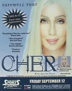 Living Proof: The Farewell Tour (also referred to as simply The Farewell Tour, later dubbed The Never Can Say Goodbye Tour) was the fifth concert tour by American singer and actress Cher to promote her 24th studio album, Living Proof (2001) and her eighth official compilation album, The Very Best of Cher (2003).[2] The tour officially began on June 14, 2002, in Toronto, Ontario, Canada, being initially planned as a 59-date tour across North America.