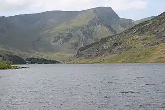 Llyn Ogwen (Welsh: [ˈɬɪn ˈɔɡʊɛn]) is a ribbon lake in north-west Wales. It lies alongside the A5 road between two mountain ranges of Snowdonia, the Carneddau and the Glyderau. Somewhat unusually, the county boundary at this point is drawn so that the lake itself lies in the county of Gwynedd, but all the surrounding land (excluding the outflow) lies in Conwy County Borough.