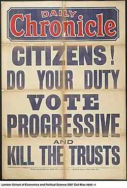In the first elections to the LCC, in January 1889, the Progressive Party, closely allied to the Liberal Party, won seventy of the 118 seats. It lost power in 1907 to the Municipal Reform Party (a Conservative organisation) under Richard Robinson.[3]