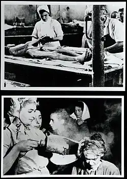 Initially, the role of the students was to take over one or two of the 200 huts each, with the responsibility of getting them cleaned (human laundry) and supervising the feeding of and fair distribution of food to the inmates.[8] The association of intravenous feeding and Nazi activities rendered this kind of feeding inappropriate.[5] An unpopular mixture known as the "Bengal mixture" was used for feeding. In addition to malnutrition and starvation, tuberculosis, typhus and cancrum oris were common, and later Wernicke's encephalopathy and pellagra.[3][8]
