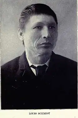 Louis Schmidt was born on December 4, 1844, at Old Fort, near Fort Chipewyan and was baptised at Portage La Loche by Father Jean-Baptiste Thibault in July 1845.[1][2] He died in Saint Louis, Saskatchewan, near Batoche November 6, 1935. In 1869 he was secretary to the first Provisional Government organized in the Red River Colony.[1] Schmidt sat as an elected member of the Manitoba Legislative Assembly for Saint Boniface West in 1870–1874 and again in 1878–1879.[1] He was the grandson of Alexis Bonami and a classmate of Louis Riel.[2]