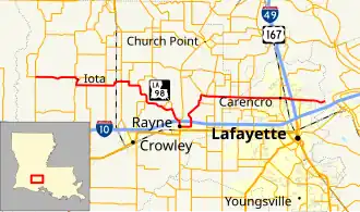 Louisiana Highway 98 (LA 98) is a state highway located in southern Louisiana. It runs 47.76 miles (76.86 km) in an east–west direction from the junction of LA 97 and LA 1123 west of Iota to the LafayetteSt. Martin parish line east of Carencro.