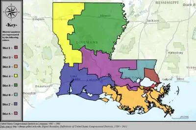 The U.S. state of Louisiana currently has six congressional districts. The state has had as many as eight districts; the eighth district was eliminated on January 9, 1993 after results of the 1990 census, and the seventh district was eliminated in 2013, following results of the 2010 census, largely because of people moving interstate after Hurricane Katrina hit the state.