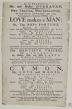 1. ^ Colley Cibber (1701). Love Makes a Man: Or, The Fop's Fortune. A Comedy. Acted at the Theatre Royal in Drury Lane, by His Majesty's Servants. Written by C. Cibber. London: Printed for Richard Parker at the Unicorn in the Piazzas under the Royal Exchange, Hugh Newman at the Grasshopper in the Poultry, and E. Rumbal at the Post-house in Russel-street, Covent Garden. OCLC 1325917466.