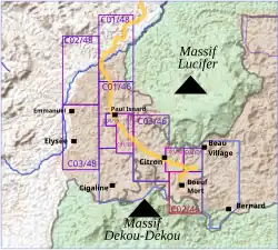 The Lucifer Dékou-Dékou Biological Reserve (French: Réserve biologique intégrale de Lucifer Dékou Dékou) is a wilderness area in French Guiana, France. The reserve is located in the communes of Apatou and Saint-Laurent-du-Maroni. It is the largest wilderness area of France, and consists of two separate parts, two mountain ranges covered in tropical rainforest; to the north are the Lucifer Mountains, to the south are the Dékou-Dékou Mountains.[3] Controversially, the Montagne d'Or mine, the biggest mining project in France, is located in between the two ranges.[4][5][6]