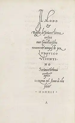 Very little is known of the circumstances of his life. He was born in Cornedo Vicentino. He may have started his career as a writing master in Venice, although this has been disputed.[1] Around 1510 he was a bookseller in Rome. He was employed as a scribe at the Apostolic Chancery in 1513. His experience in calligraphy led him to create an influential pamphlet on handwriting in 1522 called La Operina, which was the first book devoted to writing the italic script known as chancery cursive.[2] This work, a 32-page woodblock printing, was the first of several such publications.