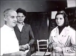 Leloir (left) with Armando Parodi and his daughter Amelia in the laboratory.