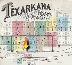 Texarkana is a city that developed on both sides of the state border between Texas and Arkansas. It was the site of the junction between two major railways that served the two-state region, and extended north to St. Louis, Missouri. The west of the city is in Bowie County, Texas and the east is in Miller County, Arkansas.