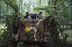 The two mechanized units were fielded for the first time on 11 June 1962.[13] During the Battle of Ap Bac in January 1963, at least fourteen of the gunners aboard the M113s were killed in action due to their exposed position, necessitating modifications to improve crew survivability.[14] Makeshift shields formed from metal salvaged from the hulls of sunken ships were soon fitted to the carriers, affording better protection; however, it was found that this material could be penetrated by small arms fire, so subsequent shields were constructed from scrapped armored vehicles.[15] The ARVN 80th Ordnance Unit in South Vietnam developed the shield idea further and commenced engineering general issue gun shields for the M113.[15] These shields became the predecessor to the standardized armored cavalry assault vehicle (or ACAV) variant and were issued to all ARVN mechanized units during the early 1960s.