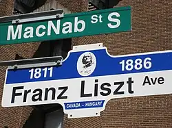 MacNab Street was named after Allan MacNab, (1798–1862), Sir Allan Napier MacNab soldier, lawyer, businessman, knight and former Prime Minister of Upper Canada.[1][2] MacNab Street South between King Street and Hunter Street West is also named Franz Liszt Avenue, named after the Hungarian composer/ conductor/ pianist.