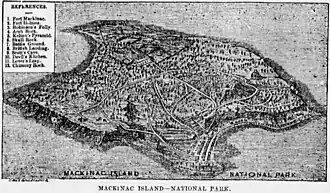 Mackinac National Park was a United States national park that existed from 1875 to 1895 on Mackinac Island in northern Michigan, making it the second U.S. national park after Yellowstone National Park. The 1,044-acre (422 ha) park was created in response to the growing popularity of the island as a summer resort. Its creation was largely the result of efforts by United States Senator Thomas W. Ferry, a native of the island. Senate Bill 28 "to set aside a certain portion of the island of Mackinaw and the straits of Mackinaw, within the State of Michigan as a national park" was introduced December 2, 1874, and signed by President Ulysses S. Grant on March 3, 1875.[1][2] The national park covered 821 acres (332 ha) while the fort retained 103 acres (42 ha) and the remainder of the island was privately owned.[3]