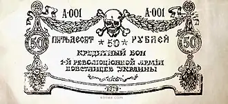 The Makhnovist ruble was produced by overprinting various banknotes of the states of the former Russian Empire, most often on the Don ruble issued by the Rostov office of the Don Republic's State Bank. There were a significant number of types of overprints. Some of them increased the denomination of banknotes by 10 times, others, which did not change the denomination of banknotes, carried the name of the Insurgent Army or its subdivision, or campaign and other texts. The Makhnovists did not issue their own paper banknotes. Full-fledged banknotes, allegedly printed and issued by the Insurgent Army, were found to be counterfeit.[1][2][3]