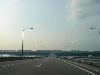 The Malaysia–Singapore Second Link (Malay: Laluan Kedua Malaysia–Singapura, Chinese: 馬新第二通道) is a bridge connecting Singapore and Johor, Malaysia. In Singapore, it is officially known as the Tuas Second Link. The bridge was built to reduce the traffic congestion at the Johor–Singapore Causeway and was opened to traffic on 2 January 1998.[1] It was officially opened by Singapore's then Prime Minister Goh Chok Tong with Mahathir Mohamad, who was then Prime Minister of Malaysia. The bridge supports a dual-three lane carriageway linking Kampong Ladang at Tanjung Kupang, Johor to Jalan Ahmad Ibrahim at Tuas, Singapore. The total length of the bridge over water is 1.92 kilometres (1.19 mi). The actual distance between both checkpoints is approximately 6 kilometres (3.7 mi). At Malaysian side, the bridge is connected to the Second Link Expressway (Malay: Lebuhraya Laluan Kedua Malaysia–Singapura) E3 also known as Linkedua Expressway, which links from Senai North Interchange Exit 253 at North–South Expressway E2, Senai Airport and Taman Perling, Johor Bahru via its extension known as Johor Bahru Parkway E3. In Singapore, the bridge connects to the Ayer Rajah Expressway.
