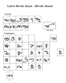 Dhives Akuru developed from Brahmi. The oldest attested inscription bears a clear resemblance to South Indian epigraphical records of the sixth-eighth centuries, written in local subtypes of the Brahmi script. The letters on later inscriptions are clearly of the cursive type, strongly reminding of the medieval scripts used in Sri Lanka and South India such as Sinhala, Grantha and Vatteluttu. There are also some elements from the Kannada-Telugu scripts.[2][3]