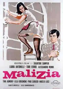Malicious (Italian: Malizia, lit.'Malice') is a 1973 Italian erotic comedy-drama film co-written and directed by Salvatore Samperi. It stars Laura Antonelli, Turi Ferro and Alessandro Momo. The film is about the sexual desire of a widower and his three sons for their new housekeeper.[2] At the Silver Ribbons awards, Antonelli and Ferro won Best Actress and Best Supporting Actor, respectively.[3] The film was entered into the 23rd Berlin International Film Festival.[4] A sequel, Malizia 2000, was released in 1991 with the same cast.