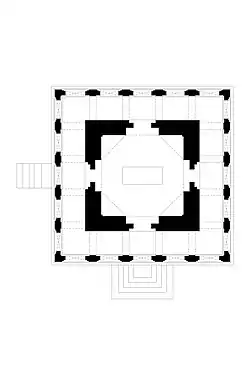 The mausoleum built in 1651 in Mudéjar style has a square plan. It has a central hall, with a sheltered arcade with sculpted brackets. The dome on the top is "three quarters hemispherical" with Adil Shahi-style "domical finials".[1] It illustrates the Saracenic style.[2]