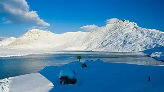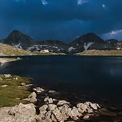 Tevnoto Lake is the largest and northernmost of the group, located in the immediate vicinity of the summits of Momin Dvor and Valyavishki Chukar.[4] It has an elongated curved shape slightly resembling a kidney. Reaching length of 487 m, width of 220 m and area of 62,490 m2, it is the eight largest lake in the mountain range and largest one in Bulgaria above 2,500 m. Its exact altitude is 2,519 m, which makes it the sixteenth highest lake in Pirin. The depth is 3.9 m; the water volume is 116,570 m3.[4][5] The homonymous Tevno Ezero shelter is situated near the out-flowing stream to the south.[4][6] Its natural beauty and majestic surroundings of rugged peaks make it a popular tourist destination.[6]